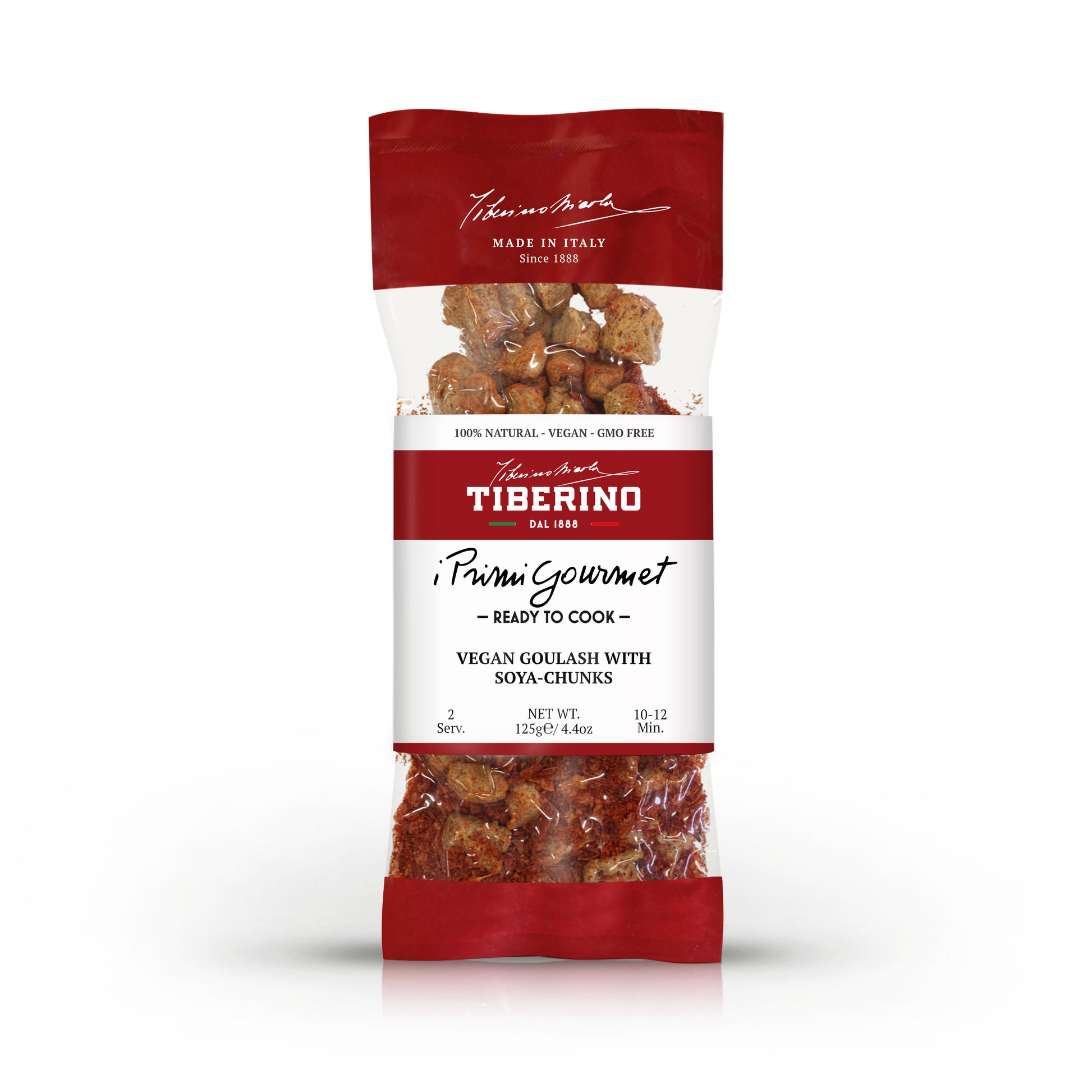 Der vegane Gulasch von Tiberino 1888 ist von den herzhaftesten Rezepten der europäischen Tradition inspiriert und wird hier in einer pflanzlichen Variante neu interpretiert. Soja, von Natur aus reich an Proteinen und Ballaststoffen, verbindet sich mit Gewürzen und sorgfältig ausgewählten Zutaten zu einem intensiven, nahrhaften und besonders befriedigenden Gericht.
